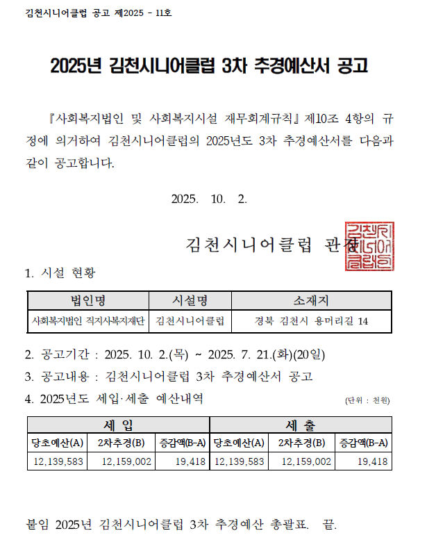 2025년 김천시니어클럽 3차 추경예산서 공고